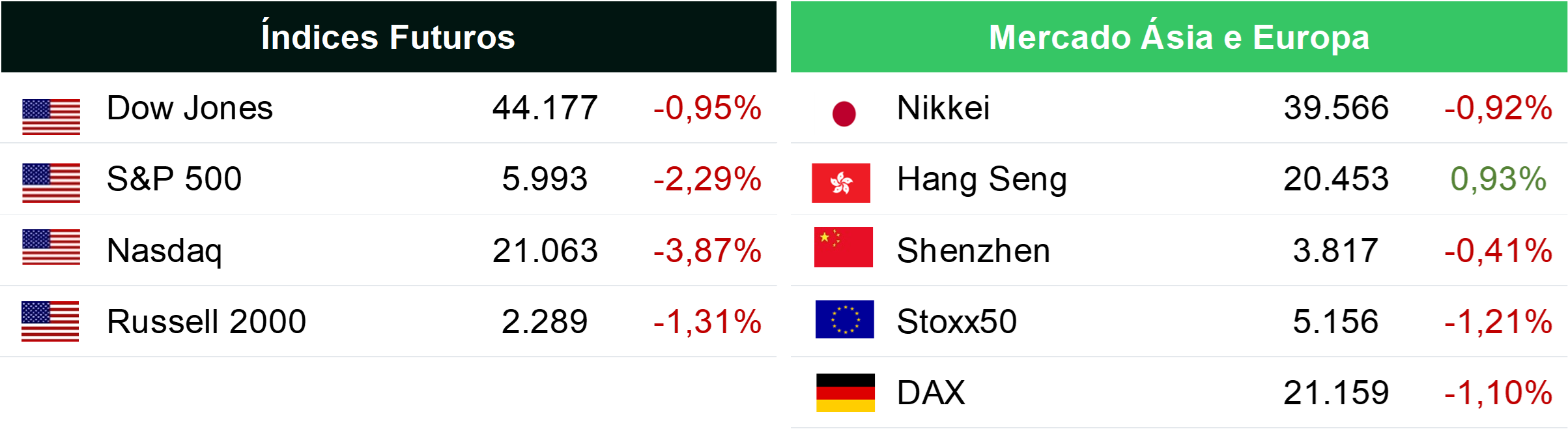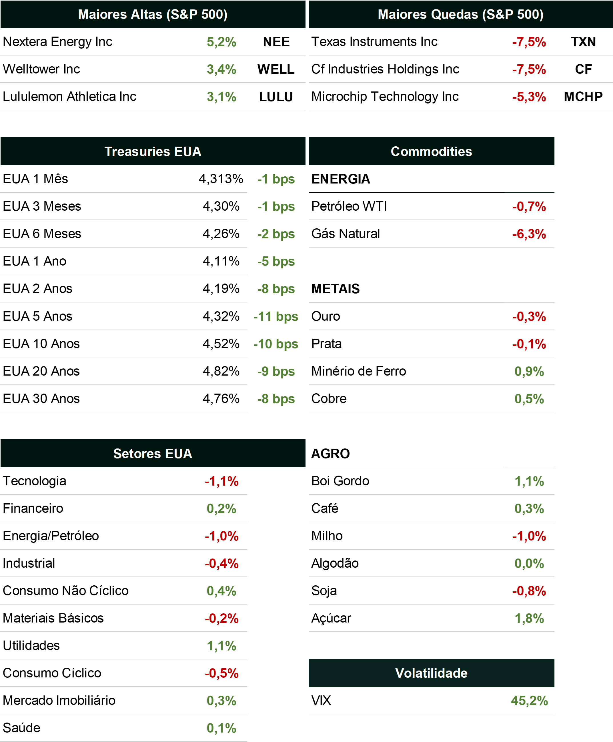 Atualização Global de Mercados: Índices e Câmbio![]() ![]() Índices utilizados para Setores EUA: índice S&P de informação e tecnologia (S5INFT), Índice S&P financeiro (S5FINL), Índice S&P de energia (S5ENRS), Índice S&P industrial (S5INDU), Índice S&P de consumo não cíclico (S5CONS), Índice S&P de materiais (S5MATR), Índice S&P de utilities (S5UTIL), Índice S&P de consumo cíclico (S5COND ), Índice S&P de mercado imobiliário (S5RLST), Índice S&P de saúde (S5HLTH). Índices utilizados para Commodities: CLA comdty (petróleo), NGA comdty (gás natural), XAU curncy (ouro), XAG curncy (prata), IOEA comdty (minério de ferro), LMCADS03 comdty (cobre), LCA comdty (boi gordo), KCA comdty (café), CA comdty (milho), CTA comdty (algodão), SA comdty (soja), SBA comdty (açúcar). Fonte: Bloomberg, 27/jan/2025 | Elaboração: Avenue Intelligence