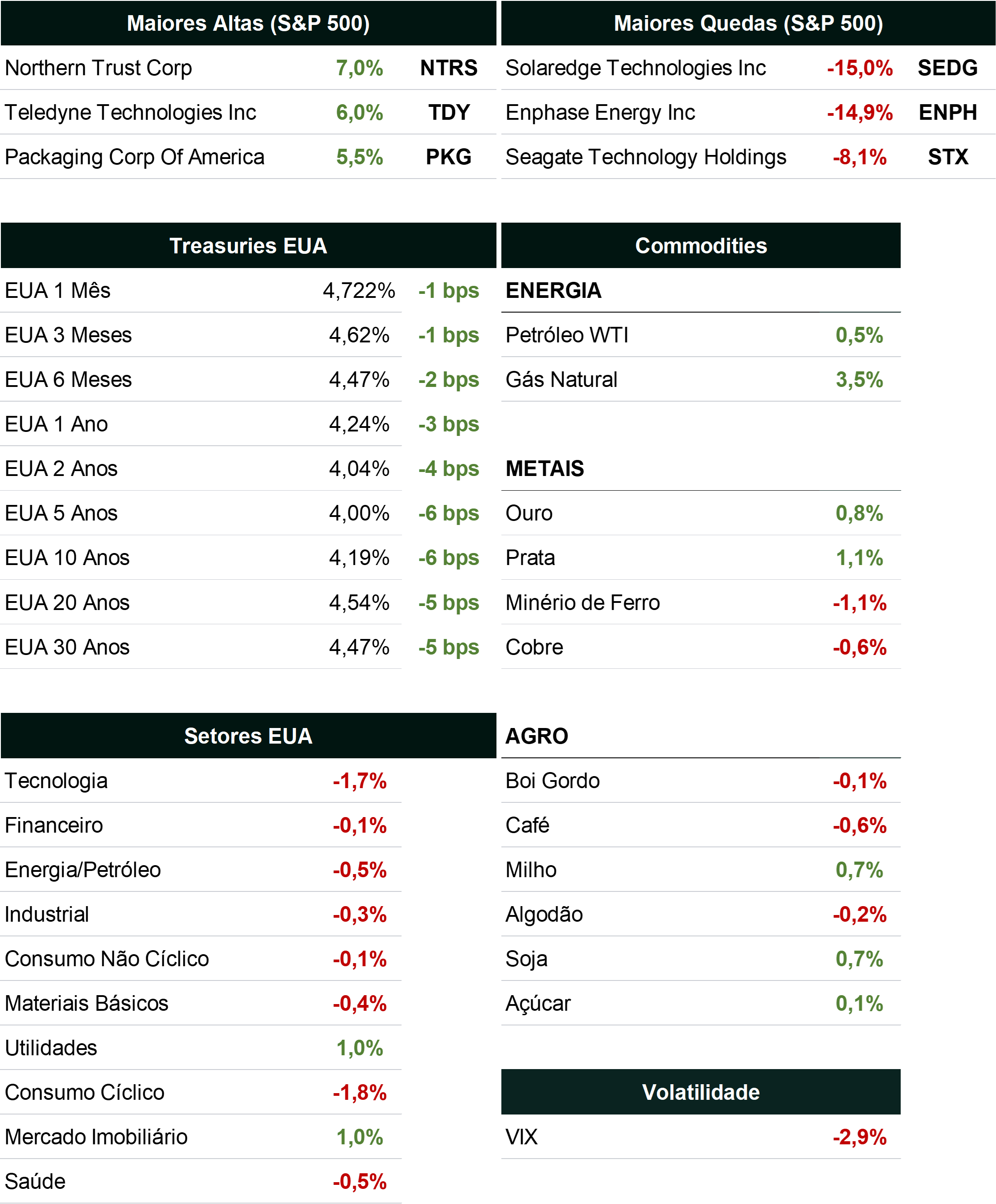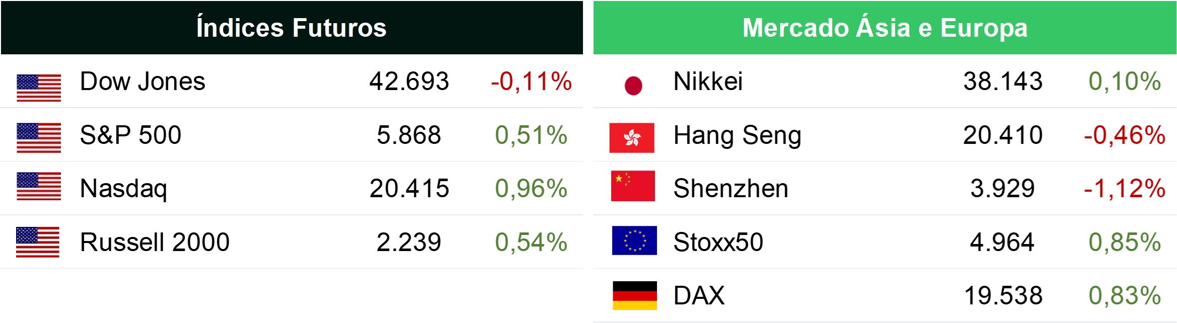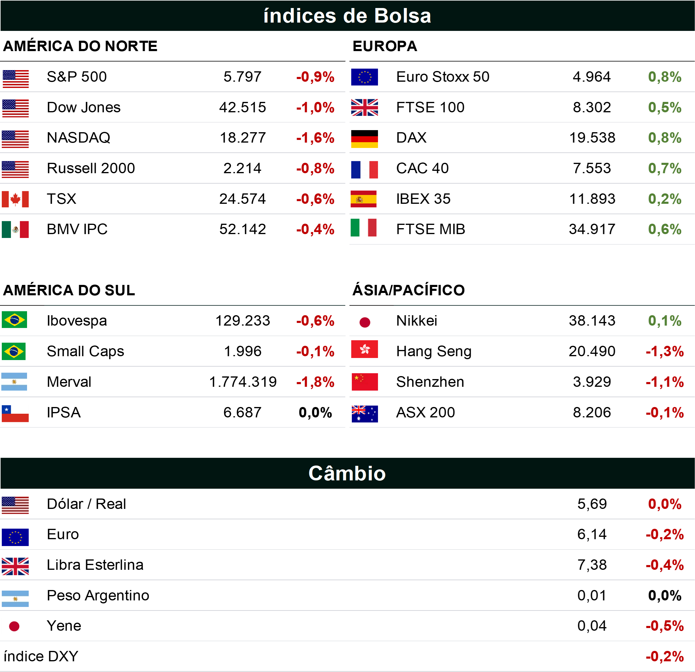 • O S&P 500 caiu 0,92% para fechar em 5.797,42, enquanto o Dow Jones teve uma queda de 0,96%, fechando em 42.514,95. Já o Nasdaq caiu 1,6% e fechou em 18.276,65;